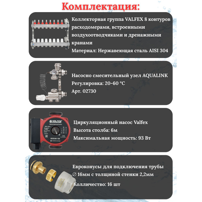 Основные характеристики Комплект для теплого пола на 8 контура VALFEX (до 160 м.кв) под трубу 16х2,2