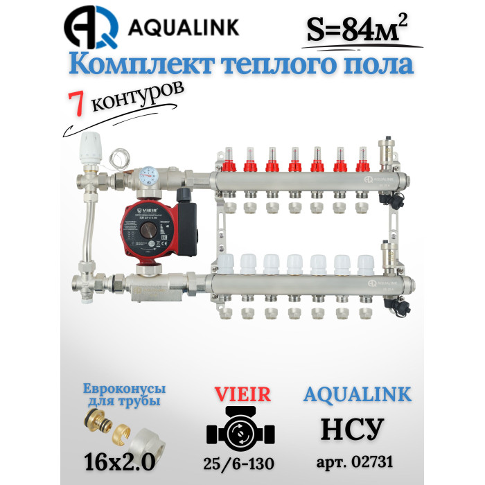 Основные характеристики Комплект тёплого пола на 7 контуров, Коллектор(AQUALINK)+Насос(VIEIR)+НСУ(AQUALINK) с байпасом+Евроконусы 16х2,0