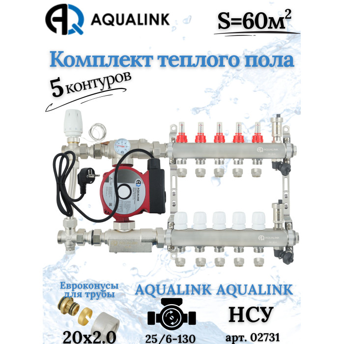 Основные характеристики Комплект тёплого пола на 5 контуров, Коллектор+Насос+НСУ с байпасом+Евроконусы 20x2,0