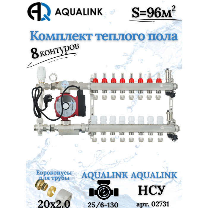Описание Комплект тёплого пола на 8 контуров, Коллектор+Насос+НСУ с байпасом+Евроконусы 20x2,0