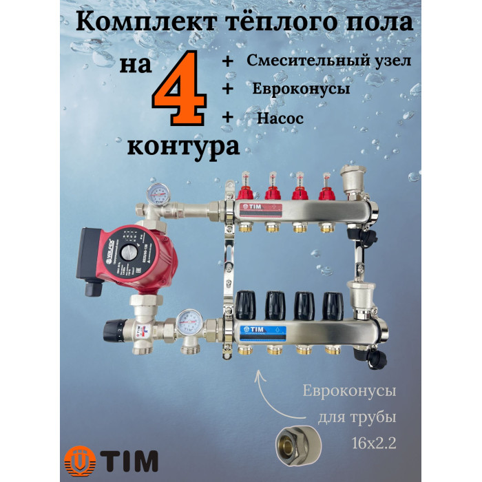 Описание Комплект для теплого пола на 4 выхода (Коллектор на 4 контура, Насос циркуляционный , Евроконусы 16x2,2, Насосно-Смесительный узел) до 60 кв.м