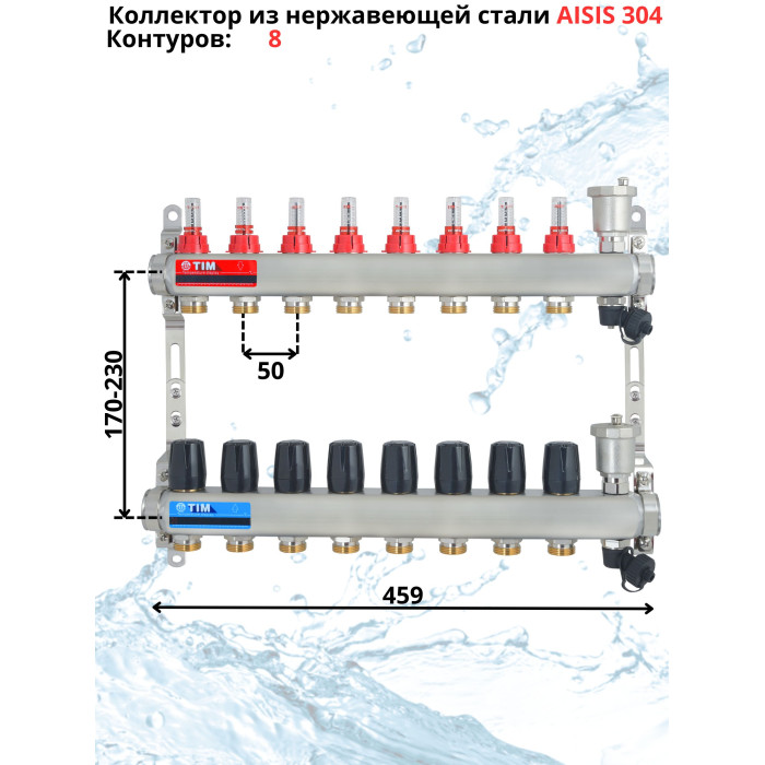 Основные характеристики Комплект для теплого пола на 8 выходов (Коллектор на 8 контуров, Насос циркуляционный , Евроконусы 16x2,2, Насосно-Смесительный узел) до 100 кв.м