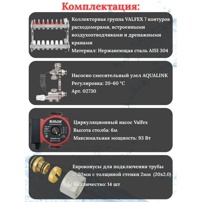 Основные характеристики Комплект для теплого пола на 7 контура VALFEX (до 140 м.кв) под трубу 20х2,0