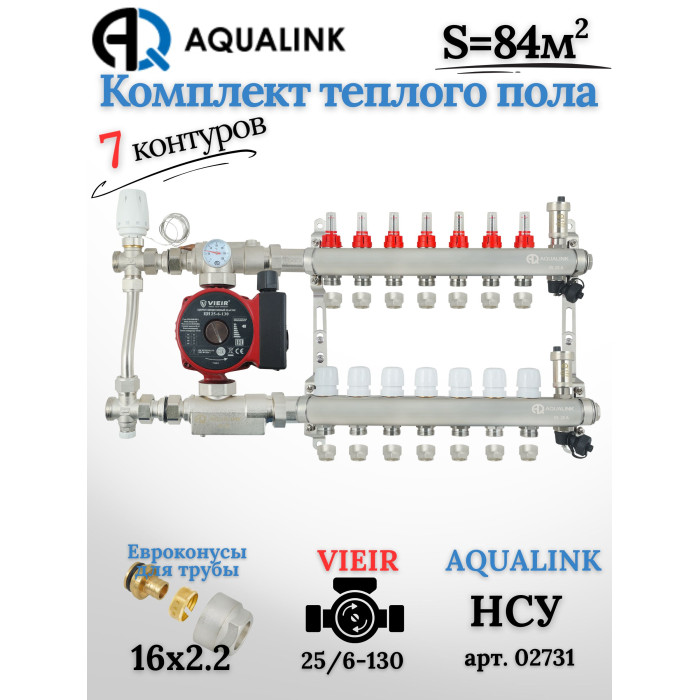 Отзывы о Комплект тёплого пола на 7 контуров, Коллектор(AQUALINK)+Насос(VIEIR)+НСУ(AQUALINK) с байпасом+Евроконусы 16x2,2