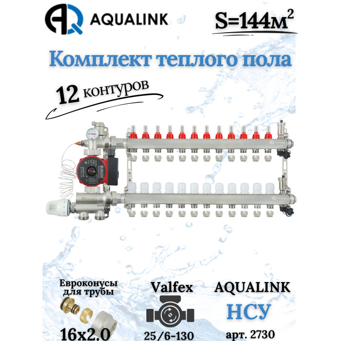Комплект тёплого пола на 12 конутра, Коллектор+Насос+НСУ+Евроконусы 16х2,0