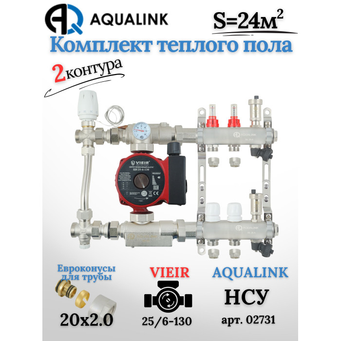 Описание Комплект тёплого пола на 2 контура, Коллектор(AQUALINK)+Насос(VIEIR)+НСУ(AQUALINK) c байпасом+Евроконусы 20x2,0