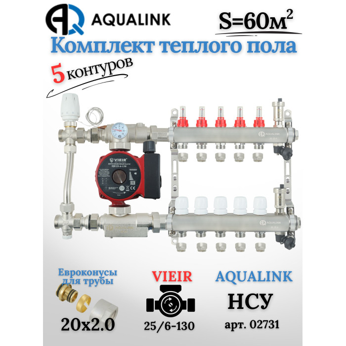 Отзывы о Комплект тёплого пола на 5 контуров, Коллектор(AQUALINK)+Насос(VIEIR)+НСУ(AQUALINK) с байпасом+Евроконусы 20x2,0