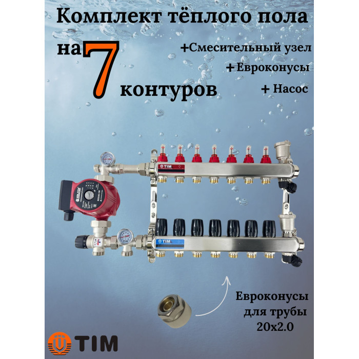Описание Комплект для теплого пола на 7 выходов (Коллектор на 7 контуров, Насос циркуляционный , Евроконусы 20x2,0, Насосно-Смесительный узел) до 90 кв.м