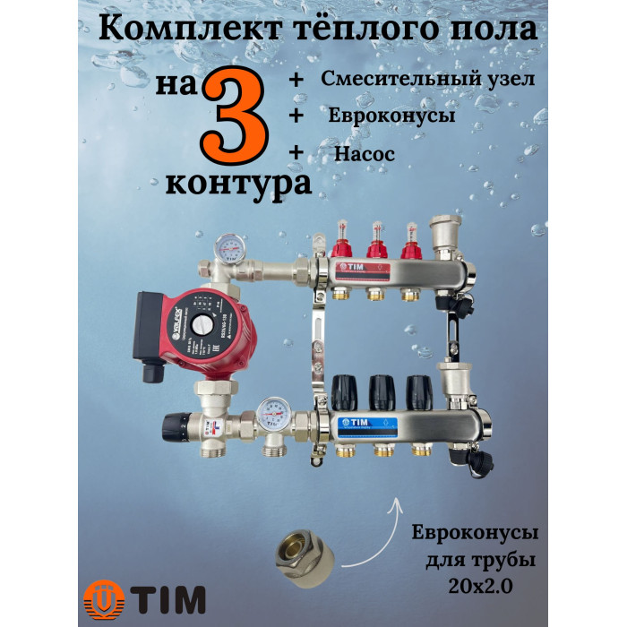 Описание Комплект для теплого пола на 3 выхода (Коллектор на 3 контура, Насос циркуляционный , Евроконусы 20x2,0, Насосно-Смесительный узел) до 60 кв.м