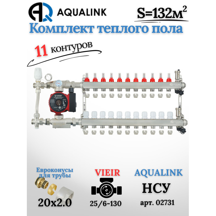 Основные характеристики Комплект тёплого пола на 11 контуров, Коллектор(AQUALINK)+Насос(VIEIR)+НСУ(AQUALINK) с байпасом+Евроконусы 20x2,0