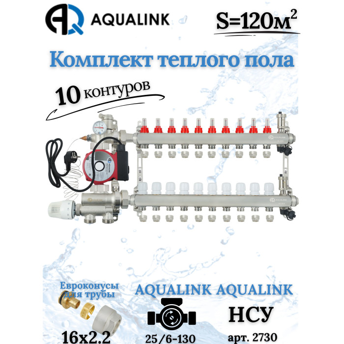 Основные характеристики Комплект тёплого пола на 10 конутра, Коллектор+Насос+НСУ+Евроконусы 16х2,2