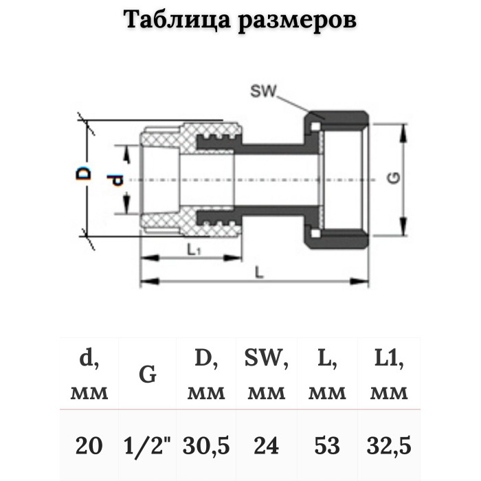 Основные характеристики Муфта с накидной гайкой 20х1/2" (150/30) (Valfex) БЕЛАЯ