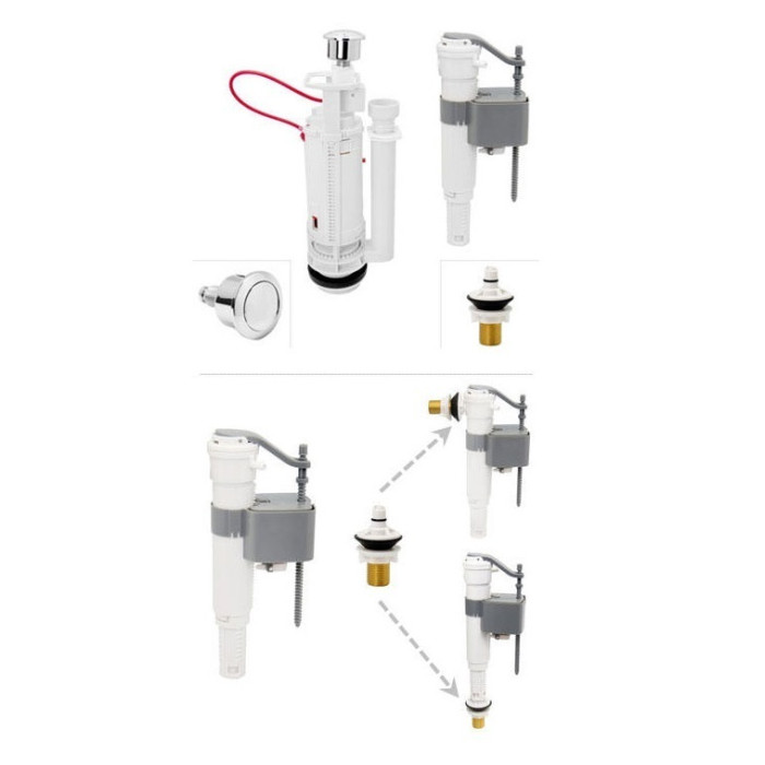 Универсальный комплект арматуры для унитаза VIEIR содержит в себе универсальный сливной механизм и универсальный заливной клапан для унитазов любых производителей.Все комплектующие выполнены из высококачественных материалов.Надежность, износостойкость, удобство и простота настройки и монтажа комплекта!1. Универсальный сливной механизм (сливной клапан) VIEIR для унитазов имеет ряд преимуществ перед своими конкурентами: Простая и быстрая установка сливной системы; Точная и очень удобная настройка высоты кнопки и высоты перелива, без лишних плясок с бубном. Нет необходимости отрезать перелив, все двигается вверх и вниз с минимальными усилиями и фиксируется поворотным фиксатором. Система слива с использованием троса из нержавеющей стали - повышает срок службы сливного механизма, упрощает монтаж и настройку сливной системы; Слив происходит ПОСЛЕ опускания кнопки смыва. Запатентованная система работы кнопки обеспечивает постоянный объем смыва и экономию воды. Кнопка прошла уже более 350 000 циклов нажатия; Высокая скорость слива - 2,6 л/сек.; Возможность ограничения полного слива воды из бачка, кнопка FULL FLUSH - позволит экономить расход воды, ограничивает полный слив воды из бака, значение регулируется от 1 до 6. Подходит под все стандартные бачки унитазов; Качественное износостойкое хромированное покрытие кнопки слива нанесенное гальваническим способом; Эластичная резиновая прокладка: долговечность даже в условиях жесткой воды; Гарантия 5 лет - подтверждает надежность системы; 2. Универсальный наливной, заливной клапан для унитаза VIEIR представляет собой качественный и достаточно продуманный механизм для наполнения вашего бачка унитаза водой.