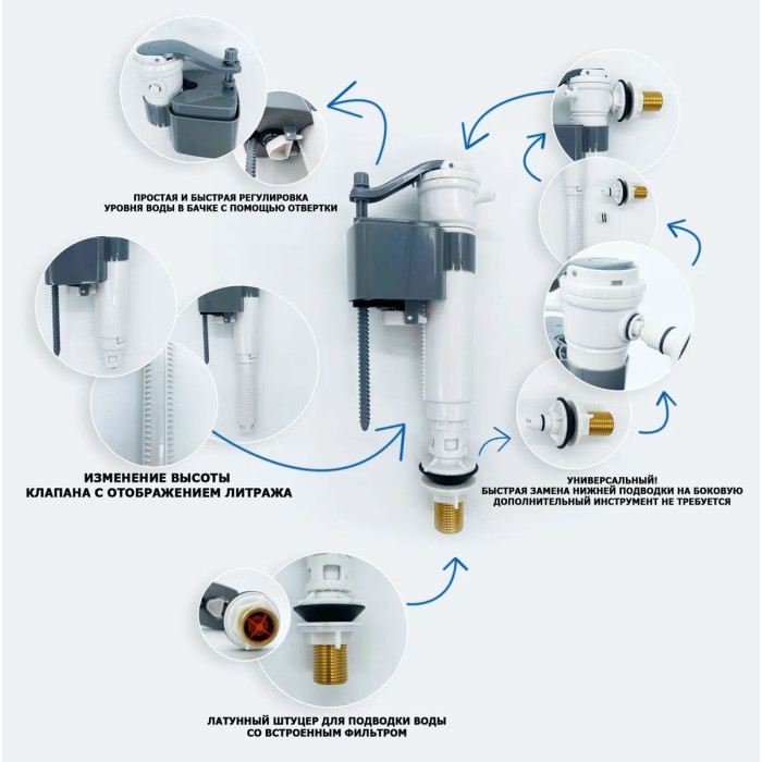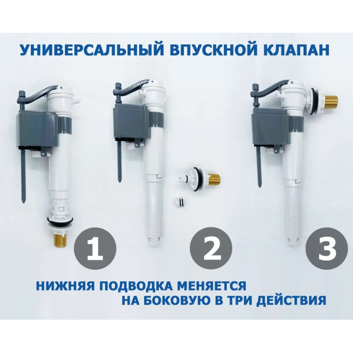 Универсальный наливной, заливной клапан для унитаза VIEIR представляет собой качественный и достаточно продуманный механизм для наполнения вашего бачка унитаза водой.Преимущества заливного клапан VIEIR перед конкурентами: бесшумное наполнение бачка унитаза - достигается за счет встроенной в клапан мембране, которая приглушает звук проходящего потока воды; плавная и легкая настройка уровня воды в бачке, тонка настройка клапана отверткой в легкодоступном после установки месте; универсальность подключения - без каких либо дополнительных инструментов можно сменить нижний подвод воды на боковой; латунный штуцер подводки - для более достаточно и надежного соединения подводки воды с клапаном; Встроенный в штуцер фильтр для воды - предотвращает засор бачка крупными частицами, окалинами и пр.