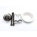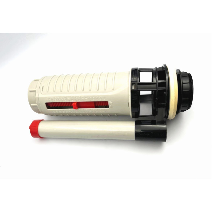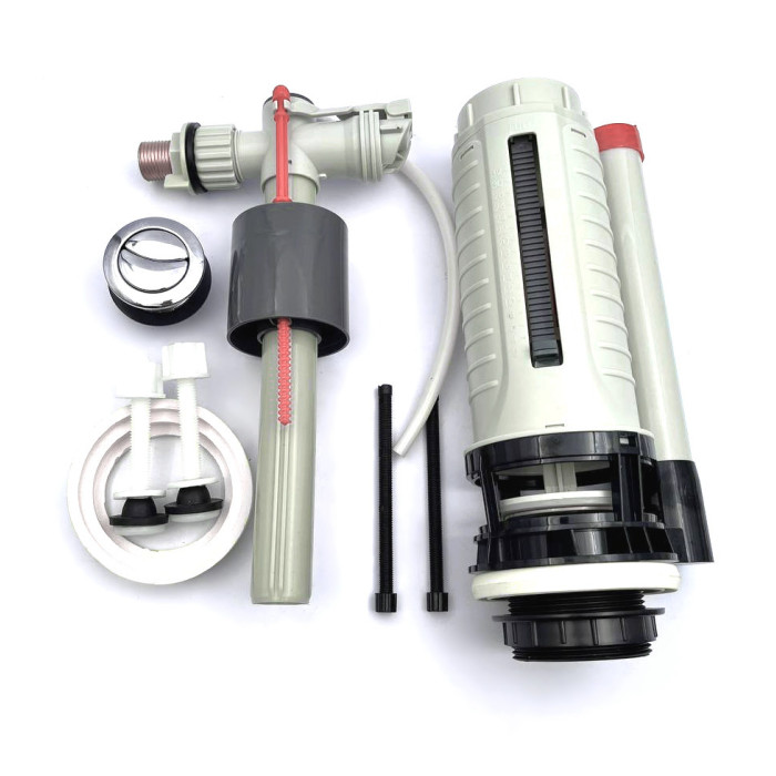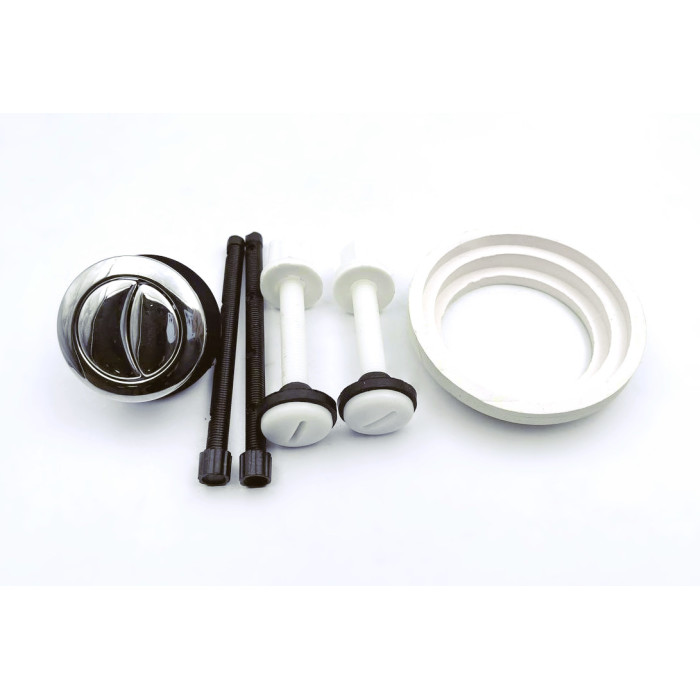 Комплект арматуры состоит из впускного механизма с боковой подачей воды, диаметром на 1/2", сливного механизма с двойной хромированной кнопкой, фиксирующих пластмассовых болтов, а также уплотнительной прокладки, которая ставится между бачком и унитазом.