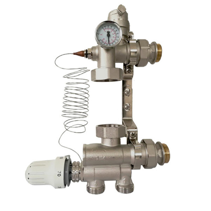 Насосно-смесительный узел TIM JH-1036 предназначен для обеспечения циркуляции теплоносителя в низкотемпературных системах отопления. Температура поддерживается с помощью термостатического вентиля, который управляется термостатической головкой с погружным датчиком.