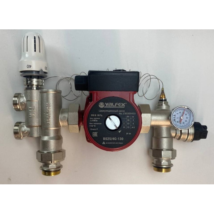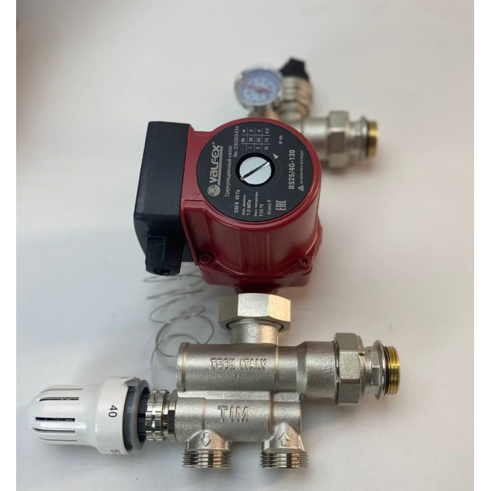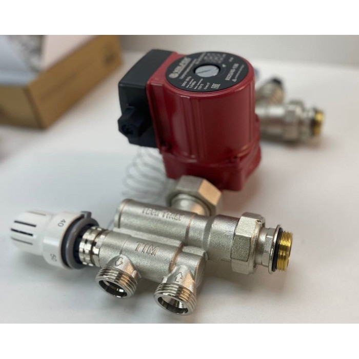 Насосно-смесительный узел TIM JH-1036 предназначен для обеспечения циркуляции теплоносителя в низкотемпературных системах отопления. Температура поддерживается с помощью термостатического вентиля, который управляется термостатической головкой с погружным датчиком.